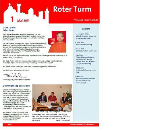 Viermal im Jahr gibt es in elektronischer Form oder zum Herunterladen auf der Homepage www.spd-ravensburg.de Neuigkeiten aus dem sozialdemokratischen Lager. In der ersten Ausgabe berichtet die SPD von einem Gespräch mit Oberbürgermeister Dr. Daniel Rapp. Stadtrat Wolfgang Engelberger kommentiert das Thema Sparzwang und geizt dabei nicht mit Spitzen gegen die schwarze Konkurrenz.