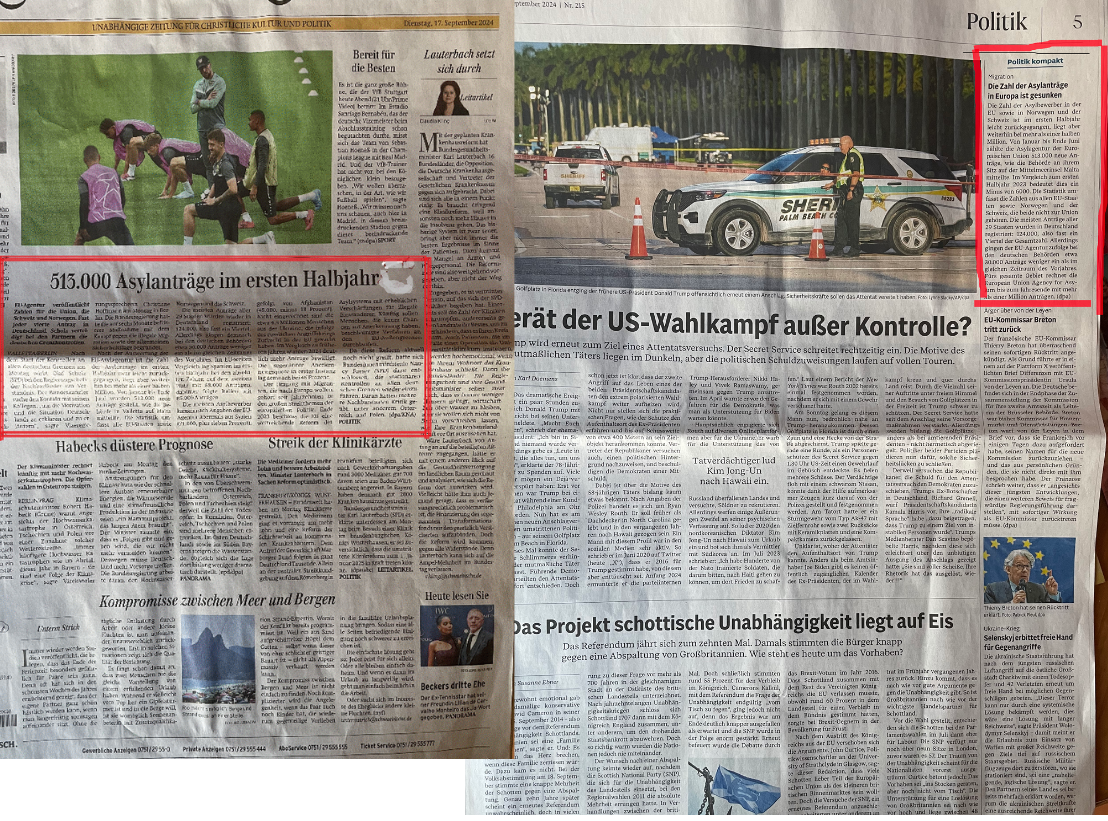 Die Schwäbische Zeitung schockiert auf der Titelseite mit einer großen Überschrift zur hohen Anzahl der Asylanttäge im ersten Halbjahr 2024.